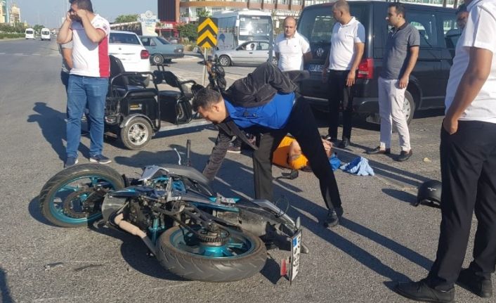 Antalya’nın Manavgat ilçesinde minibüs ile motosikletin çarpışması sonucu meydana gelen kazada motosiklet sürücüsü yaralandı. Yola savrulan sürücünün kaskının başında olmadığı öğrenildi.