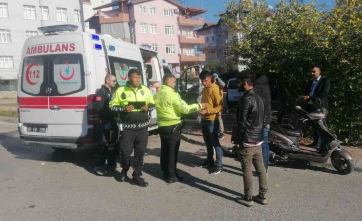 Antalya’nın Manavgat ilçesinde otomobille çarpışan motosiklet sürücüsü, kaskı sayesinde kazayı hafif yaralı atlattı. Motosiklet sürücüsü, telefonla aradığı bir kişiye motosikletini emanet ettikten sonra ambulansa bindi. Kazaya ait görüntüler güvenlik kamerasına yansıdı.