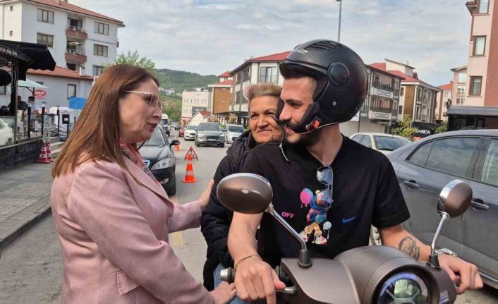Bartın’da motosikletle kasksız halde seyreden bir kadın yolcu, Trafik Haftası nedeniyle uygulama yapan Vali Nurtaç Arslan’a yakalandı. Motosiklet donanımlarının kullanılması ve trafik kurallarına uyulması konusunda sürücüyü uyaran Arslan, ceza olarak ise sürücünün motosikletteki yolcu annesine kask hediye almasını istedi.