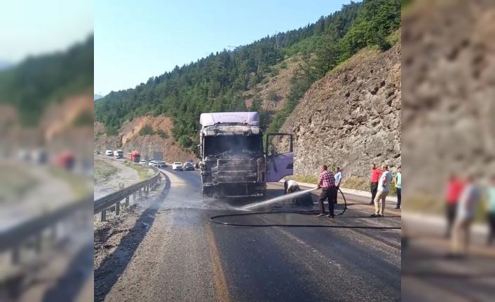 Kastamonu’da seyir halindeyken motor kısmı alevlere teslim olan tır kullanılmaz hale geldi.