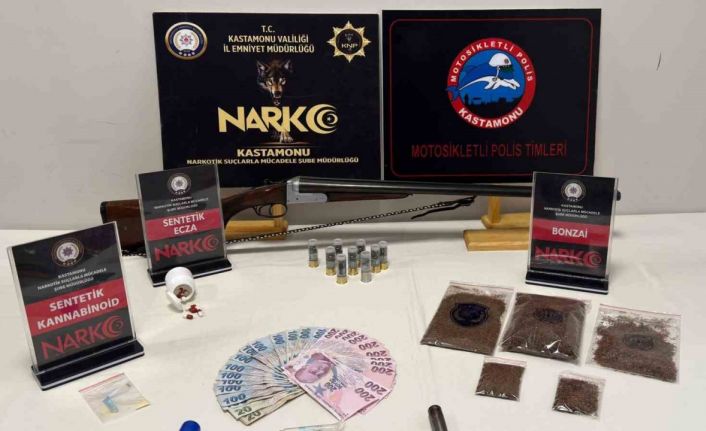 Edinilen bilgiye göre, Kastamonu İl Emniyet Müdürlüğü Narkotik Suçlarla Mücadele Şube Müdürlüğü ile Asayiş Şube Müdürlüğüne bağlı Motosikletli Polis Timleri tarafından gerçekleştirilen 2 farklı uyuşturucu operasyonunda, 114,20 gram bonzai, 0,83 gram A.M. bonzai ham maddesi, 10 adet sentetik ecza hapı, 1 adet hassas terazi, 3 adet uyuşturucu madde kullanımında kullanılan cam düzenek, uyuşturucu madde seyreltmede kullanılan 120 mililitre aseton, 1 adet ruhsatsız yivsiz av tüfeği ve bu tüfeğe ait 9 adet kartuş, 2 adet tarihi eser niteliği taşıyan obje, suçtan elde edildiği değerlendirilen 5 bin 595 TL para ele geçirildi.