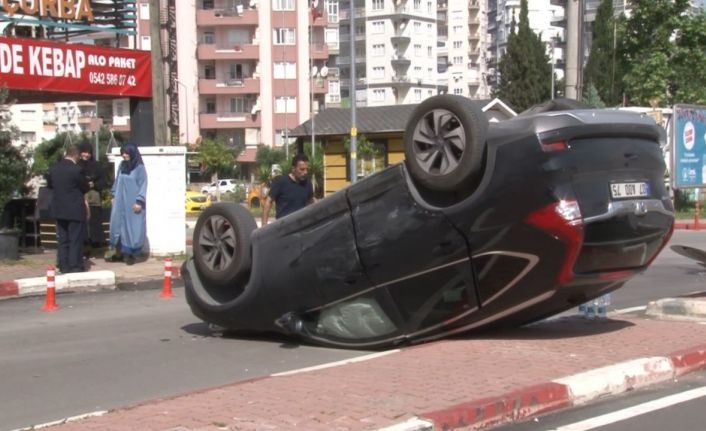 Antalya’da kavşakta çarpışan iki otomobilden biri takla attı, hafif yaralanan sürücü çevredeki vatandaşların yardımıyla araçtan çıkartıldı.