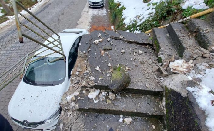 Zonguldak’ta yol kenarındaki korkulukların üzerine kaya parçasının devrilmesi sonucu kopan korkuluklar park halindeki otomobilin camına saplandı.