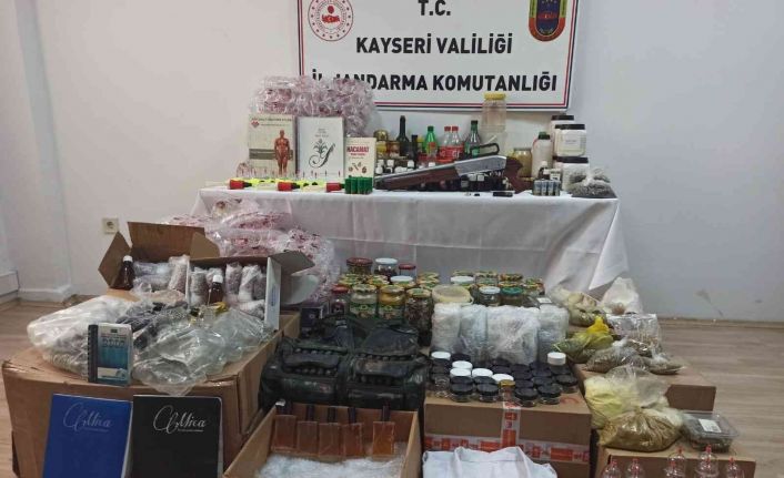 Edinilen bilgiye göre, Kayseri İl Jandarma Komutanlığı tarafından 1262 sayılı İspençiyari ve Tıbbi Müstahzarlar Kanunu ve 1219 sayılı Tababet ve Şuabatı San’atlarının Tarzı İcrasına Dair Kanunu’na muhalefet ettiği tespit edilen Y.A.’nın Melikgazi ilçesinde bulunan evine operasyon düzenlendi. Evde yapılan aramalarda, toplamda 23 adet ilaç yapımında kullanılan kurutulmuş aktar ürünleri, 28 adet cam şişe içerisinde ilaç yapımında kullanılan tıbbi aktar ürünleri, 144 adet cam şişe içerisinde içeriği belli olmayan tıbbi malzeme, 23 adet cam şişe içerisinde bitkisel sıvı karışımı madde, 8 adet plastik kutu içerisinde tedavi amaçlı kullanılan jel madde, 355 adet ilaç saklama boş cam şişesi, 38 adet ilaç saklamada kullanılan boş rimel kutusu, 14 adet cam şişe içinde tıbbi karışım, 78 adet hacamat kupası,10 adet hacamat için kullanılan vakum tabancası, 1 adet plastik su kabı içerisinde canlı 2 adet sülük, 4 adet beyaz renkli iş önlüğü, 4 adet kutusu içerisinde jilet,1 adet ruhsatsız av tüfeği, 47 adet fişek, 3 adet cep telefonu ele geçirildi.