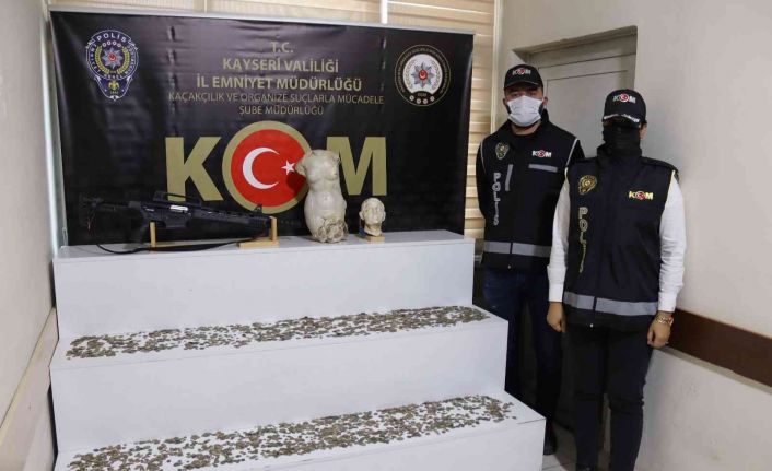 Edinilen bilgiye göre, Kayseri İl Emniyet Müdürlüğü Kaçakçılık ve Organize Suçlarla Mücadele Şube Müdürlüğü ekipleri, bir ihbar üzerine Kocasinan ilçesine bağlı Argıncık Mahallesinde 2 müstakil eve operasyon düzenledi. Operasyonda Ö.D. ve Z.E.T. gözaltına alınırken, yapılan aramalarda ise piyasa değeri 5 milyon TL olan Bizans ve Roma dönemine ait 5 milyon 100 adet sikke, 2 farklı heykel ve 1 tüfek ele geçirildi. Şahısların tarihi eserleri yurt dışına çıkaracağı öğrenilirken, ele geçirilen malzemelerin müzeye teslim edileceği bildirildi.