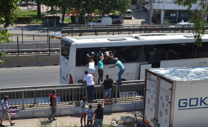 Alanya’dan Antalya Havalimanı istikametine turist taşıyan tur firması otobüsü bariyerlere çarptı. Sağ tarafı tamamen hasar gören otobüsün kapıları açılmayınca turistler camı kırarak can havliyle kendilerini dışarıya attılar. O anlar cep telefonu kamerasıyla görüntülendi.