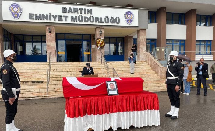 Bartın’da otobüsle otomobilin çarpıştığı kazada eşi ile birlikte hayatını kaybeden Bartın İl Emniyet Müdürlüğünde görevli Komiser Yardımcısı Uğur Özdemir (43) için emniyet binası önünde tören düzenlendi.