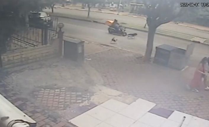 Konyaaltı ilçesi Uncalı Mahallesi Uncalı Caddesi’nde meydana gelen olayda, bir kedi ile köpek kaldırım üzerinde karşılaştı. Kedinin saldırmasıyla kaçmaya başlayan köpek yola doğru hareketlendi. Yolun ortasına kadar gelen köpeğe hızla gelen bir kurye çarptı. Kazada metrelerse sürüklenen köpek ölürken, motosikletteki kurye ise yaralandı. Yaşanan o anlar saniye saniye bir işyerinin güvenlik kamerasına yansıdı.