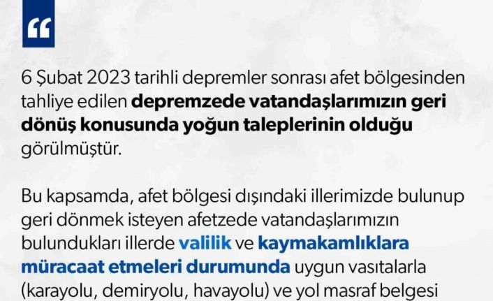 İçişleri Bakanlığının sosyal medya hesabından yapılan paylaşımda, “6 Şubat 2023 tarihli depremler sonrası afet bölgesinden tahliye edilen depremzede vatandaşlarımızın geri dönüş konusunda yoğun taleplerinin olduğu görülmüştür. Bu kapsamda, afet bölgesi dışındaki illerimizde bulunup geri dönmek isteyen afetzede vatandaşlarımızın bulundukları illerde valilik ve kaymakamlıklara müracaat etmeleri durumunda uygun vasıtalarla (karayolu, demiryolu, havayolu) ve yol masraf belgesi düzenlenerek geri dönüşleri hususunda gerekli imkan ve kolaylık sağlanacaktır” denildi.