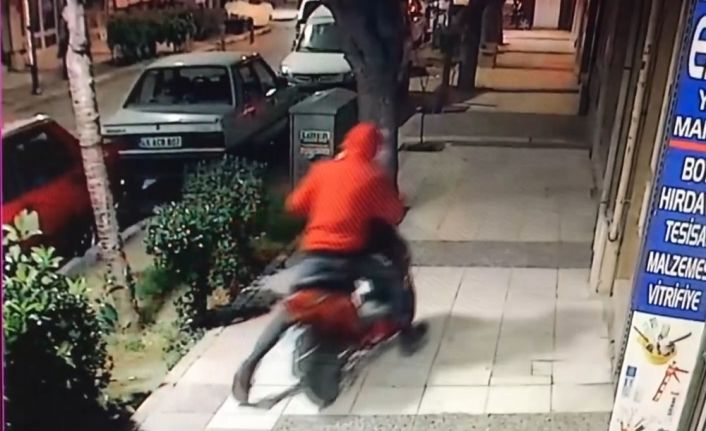 Manisa’da hırsız, gözüne kestirdiği kaldırımdaki elektrikli motosiklete sahibiymiş gibi binerek uzaklaştı. Hırsızlık anı bir iş yerinin güvenlik kamerasına yansıdı.