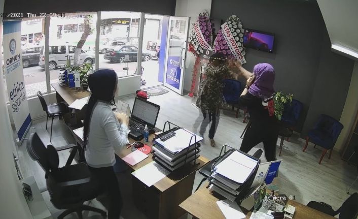 Edinilen bilgiye göre, Yeni Mahalle Av. Hulisi Yazıcıoğlu Caddesi üzerinde sigorta acenteliği yapan Nurdan Ç.’nin (36), iş yerine yanında küçük bir çocuk ile gelen Emine Ç. (47), tehditler savurarak para istedi. Çantasından çıkardığı bıçakla tehdit ederek para isteğine olumsuz cevap alan Emine Ç., daha sonra bir anda işyeri sahibi Nurdan Ç.’ye saldırmaya başladı. Bir yandan elinde telefonla polisten yardım isteyen Nurdan Ç., bir yandan da kendisine saldıran şüpheliyi biber gazı kullanarak durdurmayı başardı. Yanında çalışan elemanla birlikte etkisiz hale getirdikleri şüpheli kadını diğer esnafların yardımı ile dükkandan dışarı çıkarılmayı başardı. Bu sırada işyerinin dışına çıkarılan kadın elinde bıçakla diğer esnaflara da saldırırken, bir esnaf ise eli bıçaklı kadına eline geçirdiği askılıkla vurarak engellemeye çalıştı. Bir şahsın kadının elinden bıçağı almasının ardından olay yerine gelen polis ekiplerince Emine Ç. isimli kadın gözaltına alındı. Yaşanan olay ise işyerinin güvenlik kameralarına saniye saniye yansıdı.