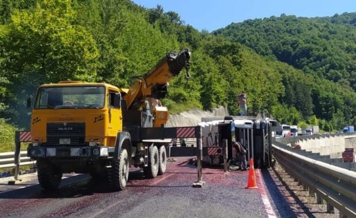 Bursa-Ankara karayolunda kontrolden çıkan kiraz yüklü kamyon devrildi; sürücüsü yaralandı.