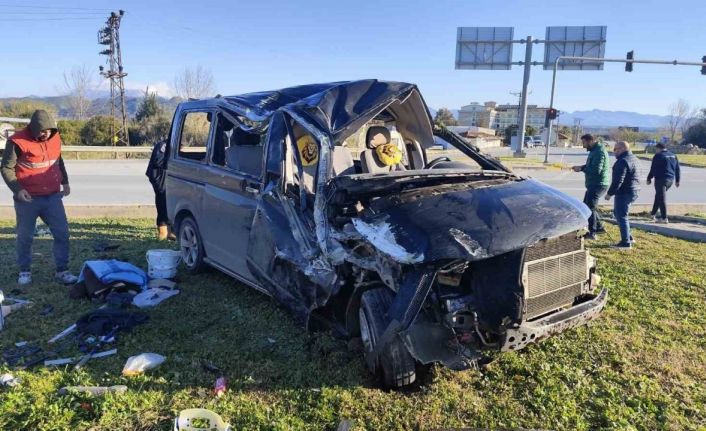 Kaza, Manavgat-Antalya D-400 kara yolu Taşağıl kavşağında meydana geldi. Edinilen bilgiye göre, Antalya istikametinden gelip yeni Antalya-Konya yoluna dönmekte olan Ahmet A.’nın kullandığı 07 YT 069 plakalı hafif ticari araç, Kadir E.’nin kullandığı 42 AGE 887 plakalı minibüse yandan çarptı. Güvenlik kamerasına yansıyan kazada kırmızı ışık ihlali yaptığı belirlenen hafif ticari aracın çarptığı minibüs kavşaktaki refüje devrildi. Kazada hafif ticari aracın sürücüsü Ahmet A. ile minibüste yolcu olarak bulunan Yusuf E., Mikail E., İbrahim E. ve Hakan E. yaralandı. Yaralılar, sağlık ekiplerinin olay yerindeki müdahalesinin ardından ambulansla hastaneye kaldırıldı.