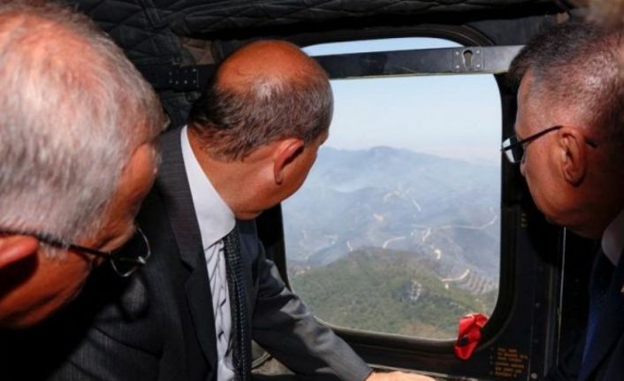 KKTC Cumhurbaşkanı Tatar, resmi temaslarda bulunmak üzere KKTC’ye gelen Cumhurbaşkanı Yardımcısı Fuat Oktay ile birlikte, helikopterle yangın alanını inceledi.