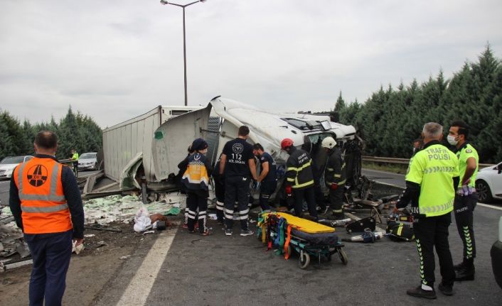Kocaeli tem Otoyolu İzmit kesiminde kontrolden çıkan bir tırın devrilmesi sonucu araç içinde sıkışarak yaralanan sürücüyü itfaiye ekipleri kurtardı. Kazada tırda yüklü olan işlenmiş balıklar ise yola savruldu.