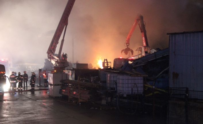 Alev alev yanan geri dönüşüm depolama alanına sevk edilen çok sayıda itfaiye ekibi yangını söndürme çalışmalarına devam ediyor. İçeride bulunan iş makinelerinin tamamen yandığı fabrikada alevler yükselmeye devam ederken, ara ara patlama sesleri de duyuluyor.