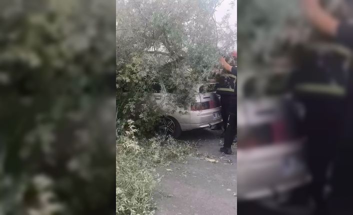 Kökünden sökülen ağaç otomobilin üzerine devrildi