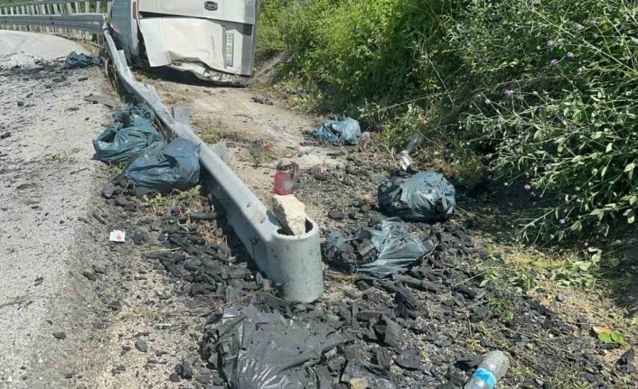 Bursa’da mangal kömürü taşıyan kamyonet hızlı girdiği virajı alamayınca yan yattı. Sürücü, ağır yaralı olarak hastaneye kaldırıldı.