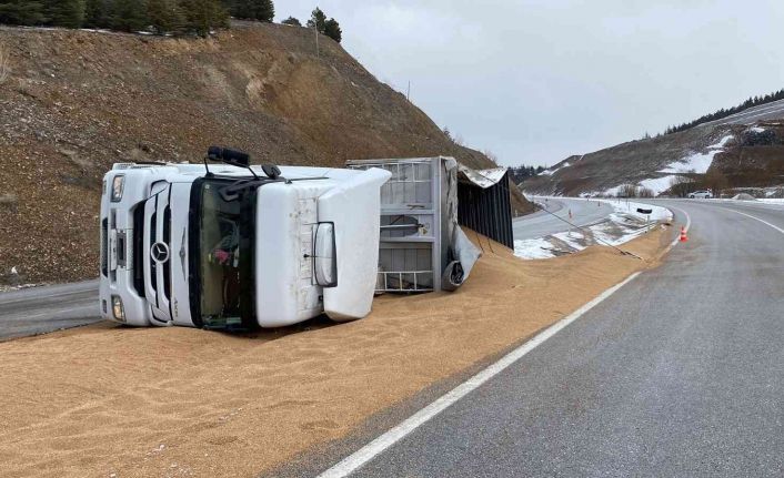 Kontrolden çıkan tır devrildi, 25 ton buğday yola saçıldı