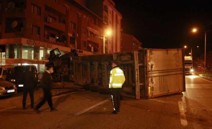 Kaza sabaha karşı saat 04.20 sıralarında Orhangazi’de meydana geldi. Alınan bilgilere göre Bursa’daki bir depodan yüklediği ve içinde tekstilden elektronik eşyaya kadar bir çok depo malzemesinin bulunduğu Mustafa Altuntaş (54) idaresindeki 34 DL 8738 plakalı TIR Orhangazi’de İznik kavşağını geçtikten sonra henüz belirlenemeyen bir nedenle kontrolden çıktı.