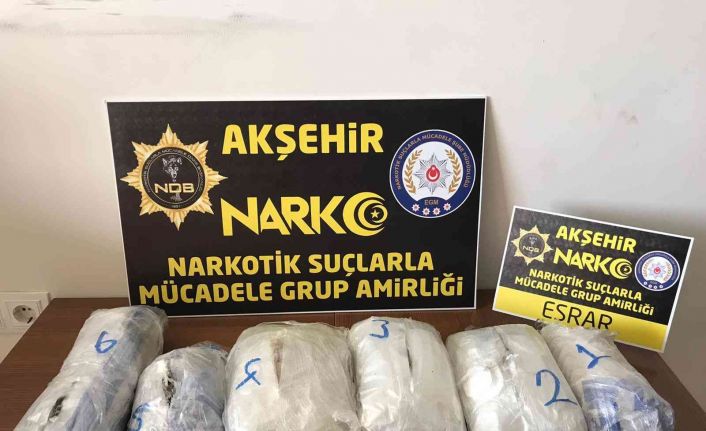 Edinilen bilgiye göre, Konya Narkotik Suçlarla Mücadele Şube Müdürlüğü ile Akşehir İlçe Emniyet Müdürlüğü Narkotik Suçlarla Mücadele Grup Amirliği ekiplerinin müşterek yaptığı istihbari çalışmalar doğrultusunda Ankara plakalı bir araçta uyuşturucu olabileceği tespit edildi. Ekipler Konya istikametinden Afyonkarahisar istikametine giden aracı bir süre takip ettikten sonra D-300 Karayolu üzerindeki uygulama noktasında durdurdu. Araçta bulunan M.T. (52) ve N.T. (51) isimli şahıslar gözaltına alınırken, otomobil de Akşehir İlçe Emniyet Müdürlüğü Narkotik Suçlarla Mücadele Grup Amirliği bahçesine getirildi. Akşehir Cumhuriyet Başsavcılığından alınan arama kararı ile araçta yapılan aramada aracın stepnesine gizlenmiş 6 parça halinde toplam 3 bin 130 gram esrar ele geçirildi. 2 şüpheli hakkında da "uyuşturucu veya uyarıcı madde imal ve ticareti suçu ile kullanmak için uyuşturucu veya uyarıcı madde satın almak, kabul etmek veya bulundurmak ya da uyuşturucu veya uyarıcı madde kullanmak" suçundan işlem yapıldı. Şüpheliler polisteki işlemlerinin ardından adliyeye sevk edildi.