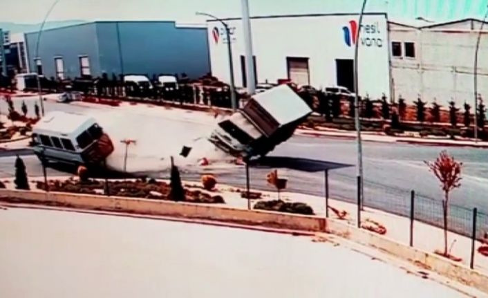 Kaza, dün 13.46 sıralarında merkez Selçuklu ilçesi Büyükkayacık Organize Sanayi Mahallesi 4. Organize Sanayi Bölgesi’nde bulunan kavşakta meydana geldi. Edinilen bilgiye göre, 410. Sokak’tan gelen kamyonet ile 413. Sokak’tan gelen minibüs çarpıştı. Çarpışmanın etkisiyle kamyonet ve minibüs savrularak devrildi. İhbar üzerine olay yerine polis ve sağlık ekipleri sevk edildi. Hastaneye kaldırılan yaralıların durumlarının iyi olduğu öğrenilirken, kaza anı güvenlik kamerası tarafından görüntülendi. Görüntülerde, kavşağa hızla giren kamyonet ve minibüsün çarpıştıktan sonra savrularak devrilmesi yer alıyor.Konya’da çarpışan kamyonet ve minibüsün devrilme anı kamerada