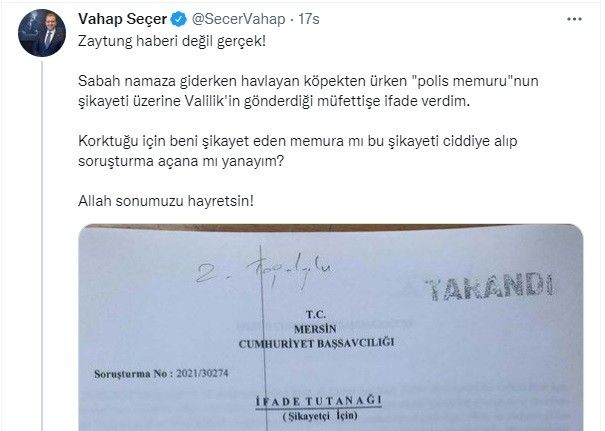 Başından geçen olayı Seçer, sosyal medya hesabından paylaştı. Seçer, "Sabah namaza giderken havlayan köpekten ürken ’polis memurunun şikayeti üzerine Valilik’in gönderdiği müfettişe ifade verdim. Korktuğu için beni şikayet eden memura mı bu şikayeti ciddiye alıp soruşturma açana mı yanayım? Allah sonumuzu hayretsin!" dedi.