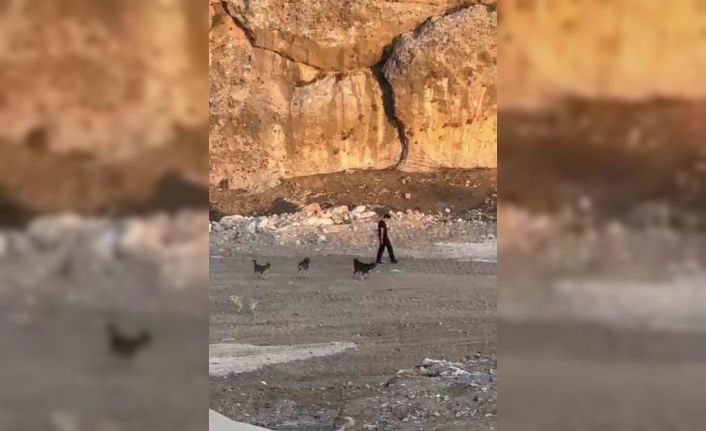 Mardin’in Artuklu ilçesinde bir kişinin kendisine saldırmaya çalışan köpeklere aldırış etmeden yoluna devam etmesi dikkat çekti.