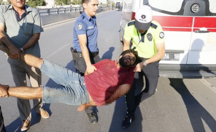Adana’da madde bağımlısı bir kişi alt geçit köprüsünün üzerine çıkarak kendini jiletleyip ortalığı birbirine kattı. Gün içinde ikinci defa çıktığı öğrenilen şahsı, polis köprüden aşağı çekerek indirerek etkisiz hale getirdi.