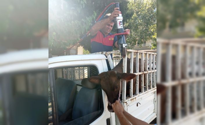 Cumhuriyet Mahallesi’nde seyir halindeki kamyonetin kasasında bulunan büyükbaş kurbanlık kafasını kasanın demir korkulukları arasına sıkıştırdı. Kurbanlık sahipleri dananın kafasını sıkıştığı yerden çıkaramayınca itfaiye ekiplerine haber verildi. Kısa sürede olay yerine gelen itfaiye ekipleri, kamyonet kasasının demir korkuluklarını birbirinden makine yardımıyla ayırdı. Demirlerin ayrılması ile dananın kafası bulunduğu yerden çıkarıldı. Hayvan sahipleri, yardımlarından dolayı Adıyaman Belediyesi İtfaiye Müdürlüğü ekiplerine teşekkür etti.Korkuluklara sıkışan kurbanlığı itfaiye kurtardı