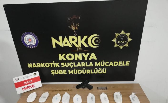 Edinilen bilgiye göre, Konya Emniyet Müdürlüğü Narkotik Suçlarla Mücadele Şube Müdürlüğünce yapılan çalışmalar kapsamında il merkezinde durumundan şüphelenilen bir otomobil ekipler tarafından durdurulmak istendi. Otomobili sürücüsü ihtara uymayarak kaçmaya başladı. Yaşanan kovalamaca sonucunda otomobil ekipler tarafından kıskıvrak yakalandı. Polisin narkotik köpeğiyle arabada yaptığı aramada, gizlenmiş halde 18 parça halinde preslenip paketlenmiş 3,5 kilogram esrar ve 1 adet ruhsatsız tabanca ele geçirildi. Otomobilde bulunan yabancı uyruklu 2 şahıs “uyuşturucu madde ticareti yapmak” suçundan gözaltına alındı.