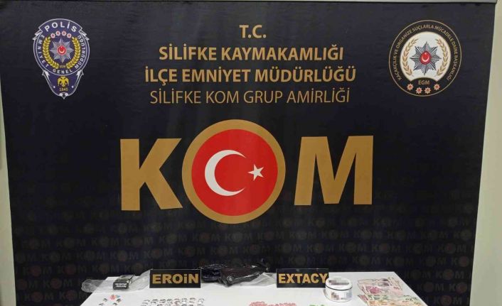 İl Emniyet Müdürlüğünden yapılan açıklaya göre, Silifke ilçe Emniyet Müdürlüğü Kaçakçılık ve Organize Suçlarla Mücadele Grup Amirliği ekipleri, M.Ü. isimli şahsın evinde ve üzerinde arama yaptı. Yapılan aramada 100 fiş halinde 52 gram eroin ile bir krem kutusu içinde 464 adet extacy uyuşturucu hap ele geçirdi.