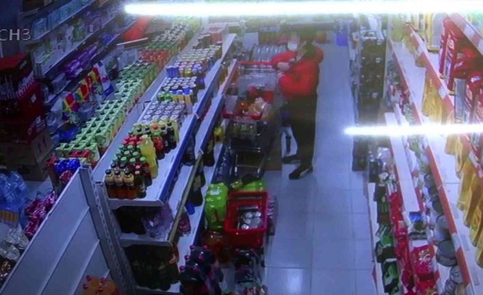 Hırsızların soğuk içecekleri çanta ve montuna koydukları anları marketin güvenlik kamerası tarafından kaydedildi