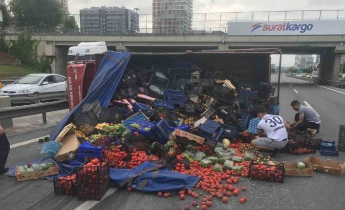 Küçükçekmece’de sebze yüklü kamyon devrildi: Yüzlerce kilo sebze yola savruldu