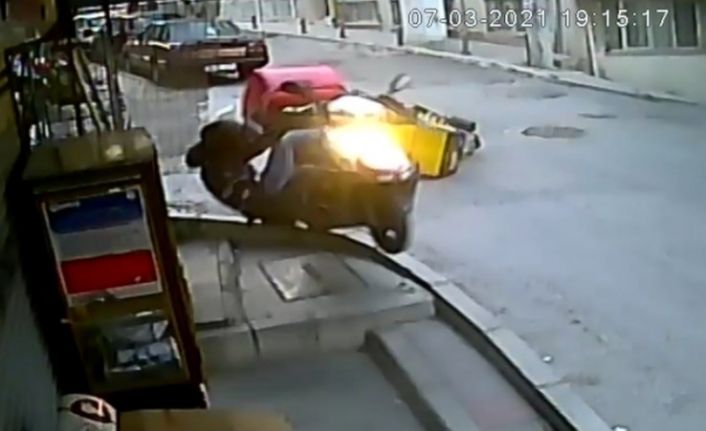 İzmir’in Konak ilçesinde meydana gelen kazada iki kurye kafa kafaya çarpıştı. Kazada bir kurye yaklaşık 4 metre ileriye uçarken, kaza anları çevrede bulunan bir marketin güvenlik kamerasınca saniye saniye kaydedildi.