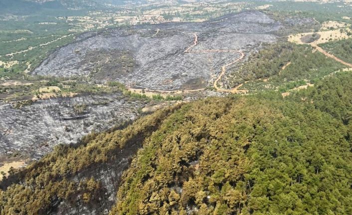 Kütahya Orman Bölge Müdürlüğü Tavşanlı Orman İşletmesi Balıköy Şefliği Gevrekler köyü yakınlarında dün saat 14.07 sularında çıkan orman yangını yoğun mücadele sonucu kontrol altına alınırken, yanan alanlar havadan görüntülendi.