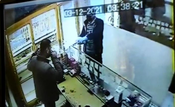 Polise teslim edilen soyguncu, hastanede tedavi altına alınırken yaşanan soygun girişimi güvenlik kamerasına yansıdı. Dükkana giren şapkalı soyguncunun yüzünü cerrahi maske ile kapatarak eldiven giydiği görüldü. Kuyumcuya silah doğrulup poşete koyduğu altınları alan soyguncu, dükkandan çıkıp kaçtı. Kasadaki ruhsatlı tabancasını alan kuyumcu da soyguncunun arkasından çıkıp kovaladı.