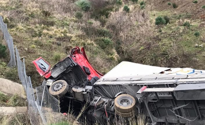 Kuzey Marmara otoyolu Riva mevkiinde kontrolden çıkan tır bariyerleri aşarak şarampole uçup yan yattı. Sürücünün yaralandığı kazada adeta faciadan dönüldü.