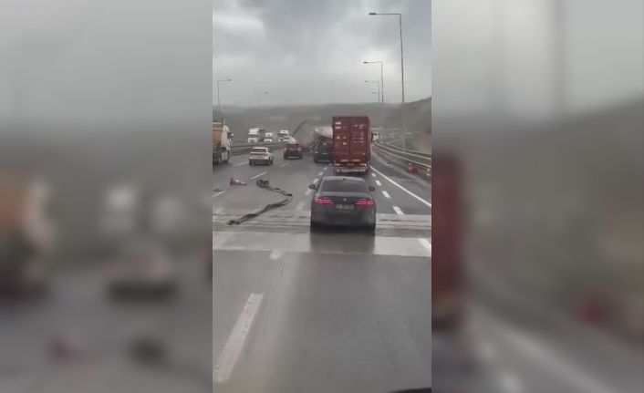 Kocaeli’de gece saatlerinden etkili olan fırtına, ulaşımda aksamalara yol açtı. Kuzey Marmara Otoyolu’nun Dilovası ilçesi geçişinde de seyir halinde olan iki tır ve kamyonet, şiddetli rüzgarın etkisiyle kontrolden çıkarak devrildi. Kazalarda şans eseri yaralanan olmazken, tırın devrildiği anlar saniye saniye cep telefonu kamerasına yansıdı.