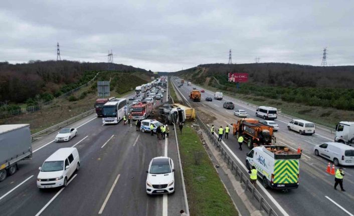 Kuzey Marmara Otoyolu’nda hafriyat kamyonu yan yattı
