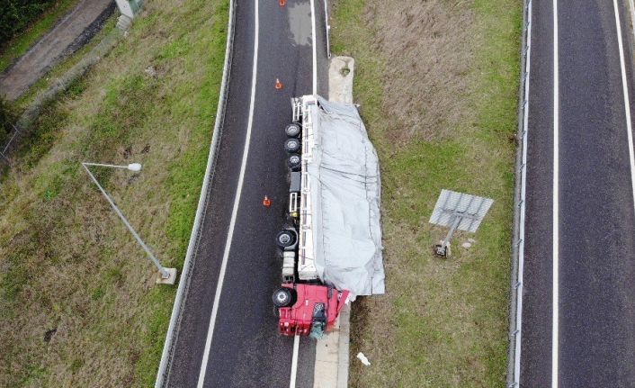 Kuzey Marmara Otoyolu Riva Kavşağı mevkiinde seyir halindeki iplik yüklü tır devrildi. Aşırı yük nedeniyle devrilen tırda bulunan 2 kişi yaralandı. Yaralılar hastaneye kaldırıldı. Kaza yapıp devrilen tır ise havadan görüntülendi.