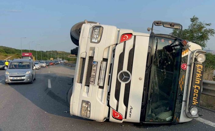 Çekmeköy Kuzey Marmara Otoyolu’nda seyir halindeki hafriyat yüklü kamyon devrildi. Kazada kamyon şoförü hafif şekilde yaralandı.