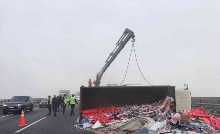Kuzey Marmara otoyolunda kamyon yola devrildi, zincirleme kaza meydana geldi