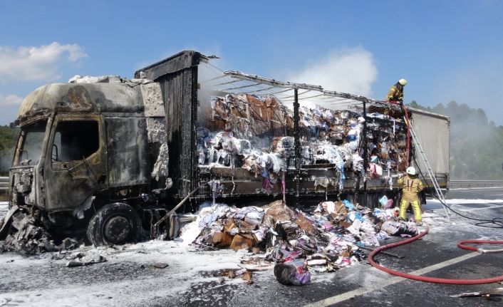Kuzey Marmara Otoyolu’nda tekstil ürünlerinin yüklü olduğu tır alev alev yandı. Motor kısmından çıktığı tahmin edilen yangında tır sürücüsünün alevleri erken görmesi hayatını kurtardı. Otoyolun ortasında yanan tır trafiğin durmasına neden oldu.
