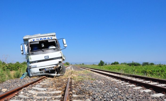 Manisa’da seyir halindeyken lastiği patlayan kamyon karşı şeride geçerek, tren raylarının üzerine çıktı. Şans eseri kazada ölen ya da yaralanan olmadı.