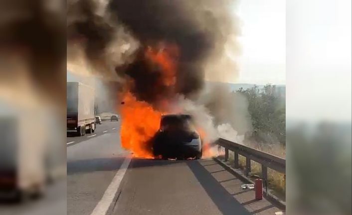 TEM Otoyolu’nun Bolu geçişinde İstanbul istikametinde seyreden lüks otomobil alev topuna döndü. Alev alev yanan araçtan geriye hurda yığını kaldı.
