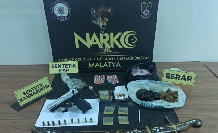 2.21 gram metamfetamin, 320 gram sentetik kannabinoid, 5 gram esrar maddesi, 1 adet ruhsatsız tabanca ve 9 adet mermi, 1 adet kesici alet ele geçirilirken; B.Y, S.Y, B.Y gözaltına alındı.