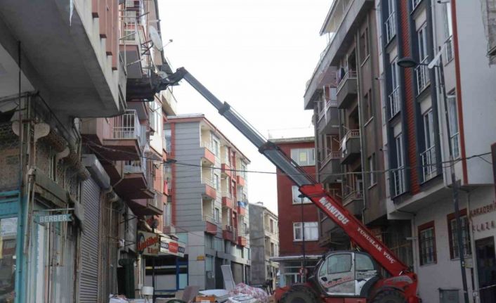 Malatya’da bazı ev sahipleri, depremden hasar gören binalardaki eşyalarını vinç yardımı ile taşımaya çalışıyor.
