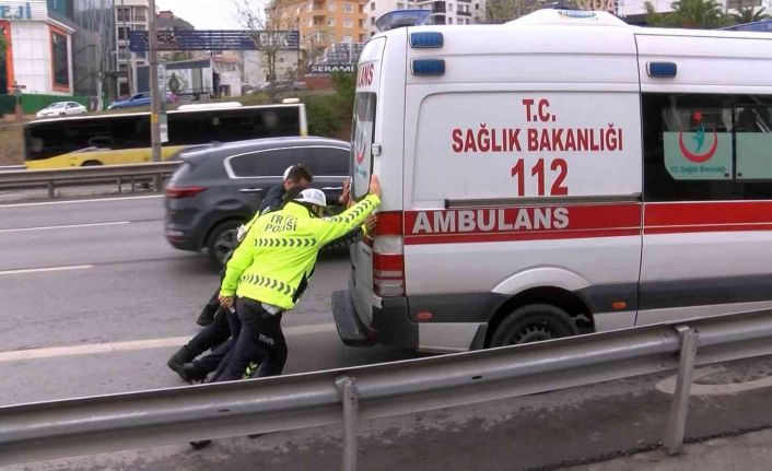 Arızalanan ambulansı polis iterek güvenli bölgeye taşıdı