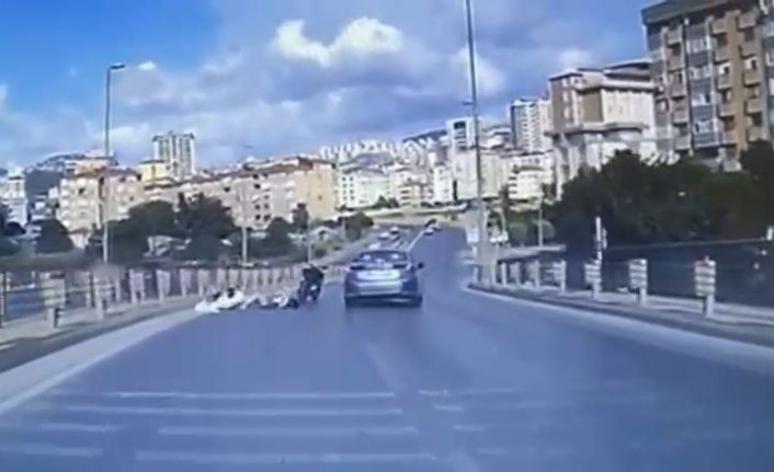 Kaza anı ise saniye saniye araç içi kamerasına yansıdı. Görüntülerde hızla ilerleyen motosiklet yolun ortasındaki refüje çarpıyor ve motosikletteki iki kişi yola savruluyor. Kazaya tanık olan sürücüler ise araçlarını durdurup yaralıların yardımına gidiyor.